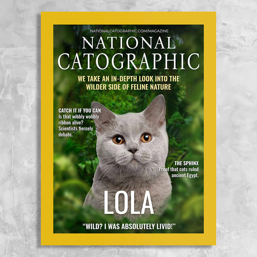 National Catographic Magazine Cover Featuring a Cat with imaginary article titles- Personalized Gift for Cat Owners