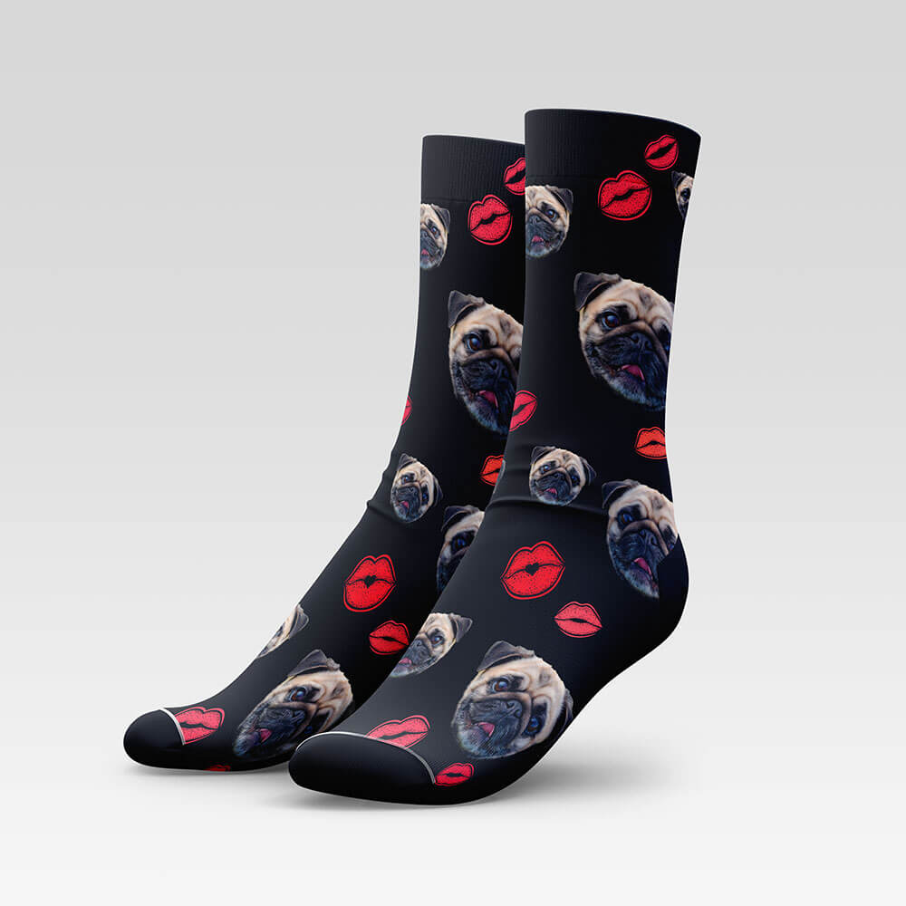 Show your pet some love with our kisses-themed custom pet socks! Simply upload a photo of your furry, feathery, or scaly friend, and we’ll pair their adorable face with a playful lipstick kiss design in the color of your choice.