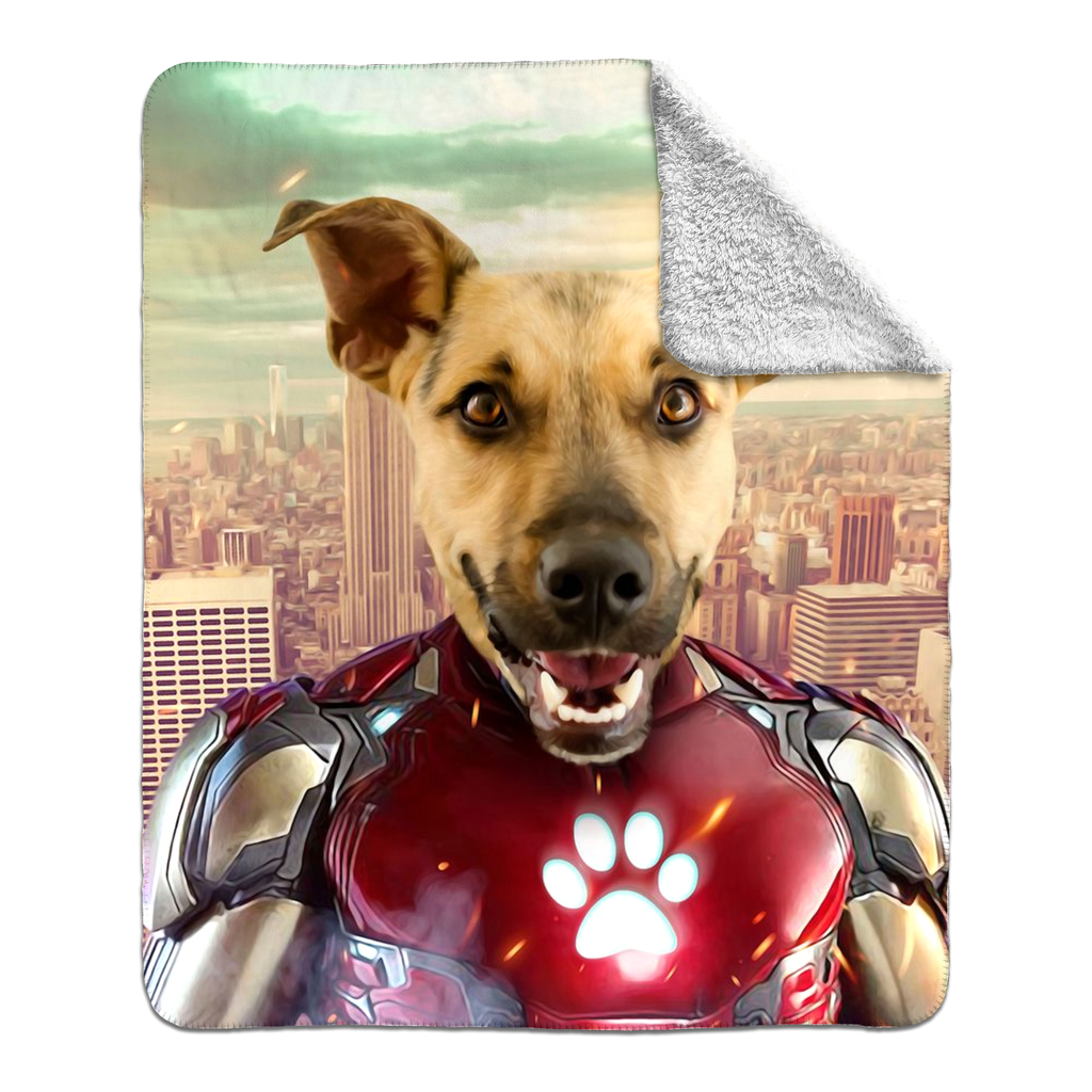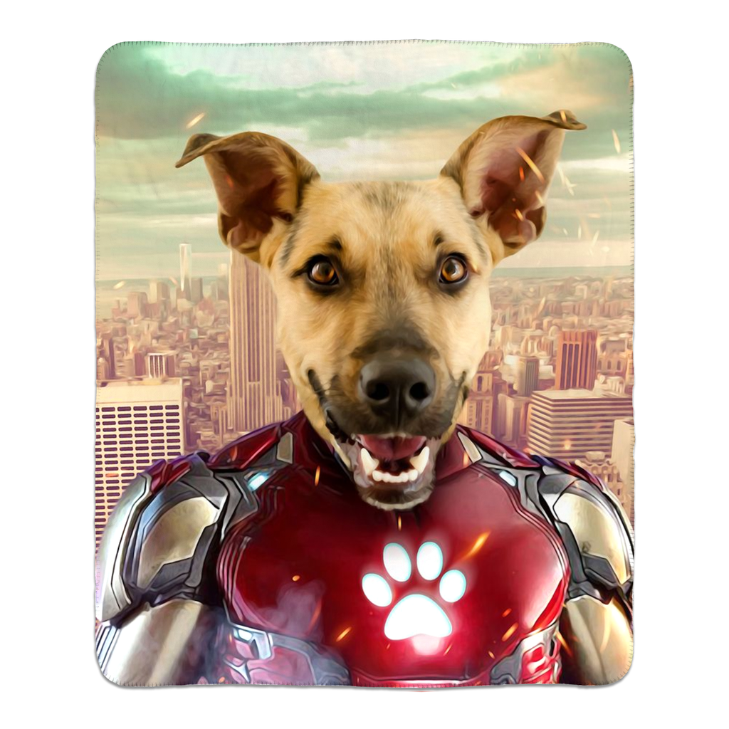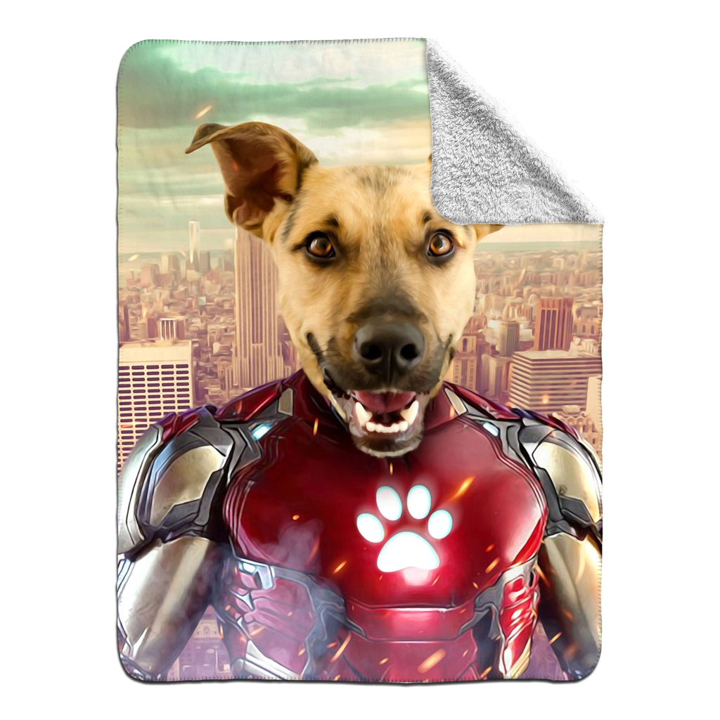 This custom pet photo blanket is inspired by Ironman and superheroes.