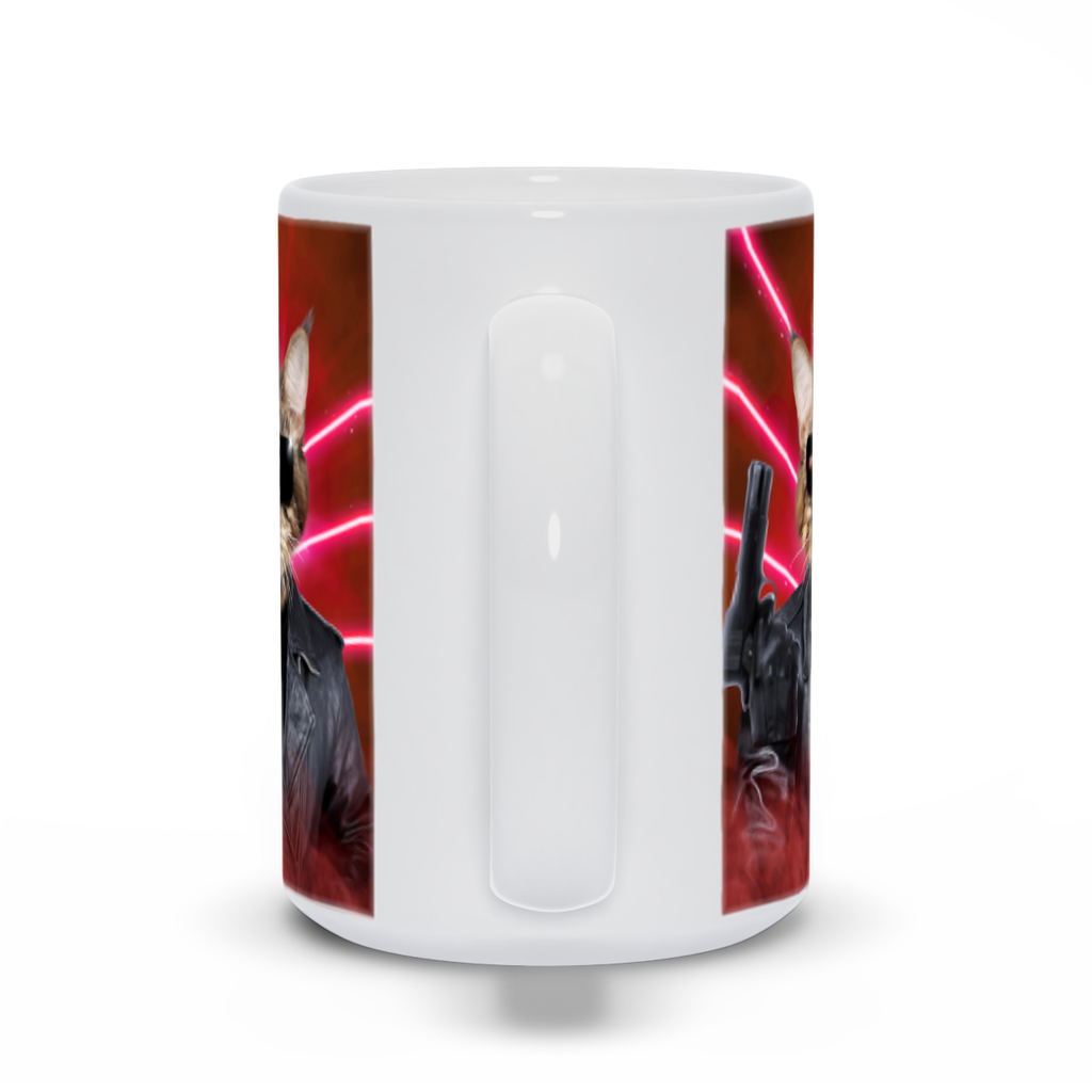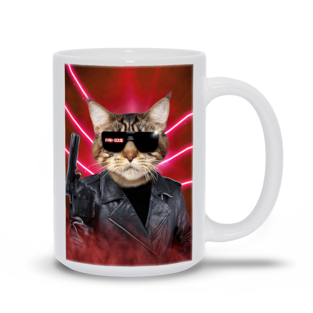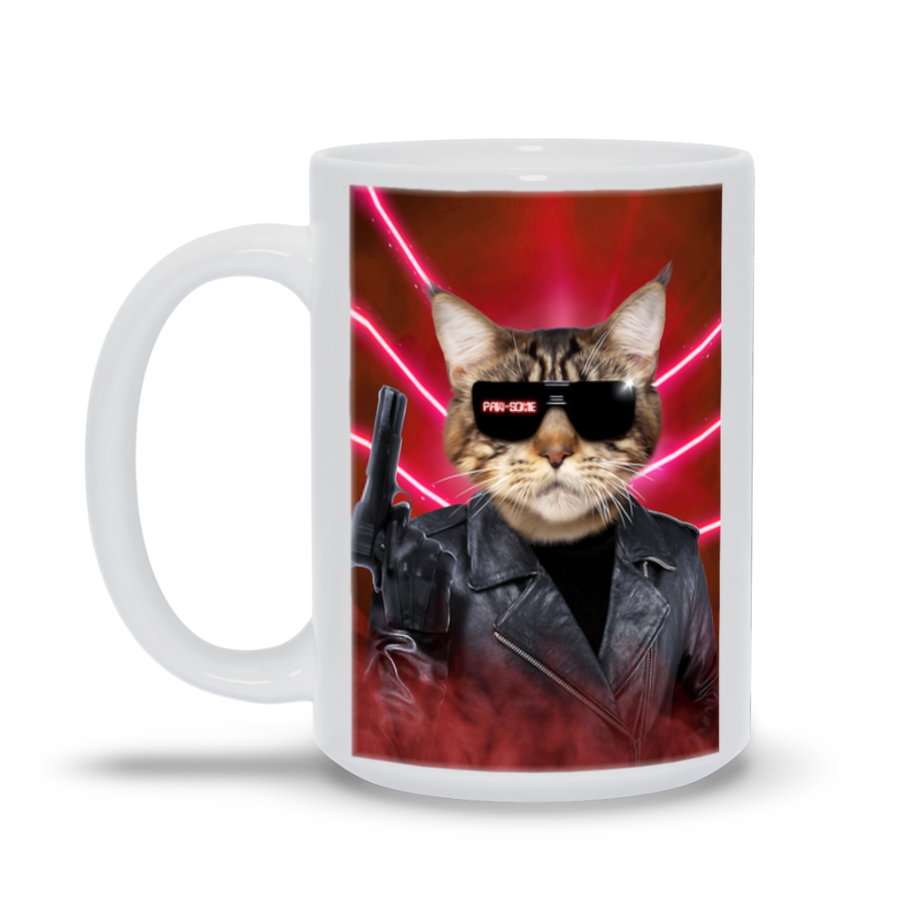This pet portrait coffee mug is inspired by The Terminator and Arnold Schwarzenegger.